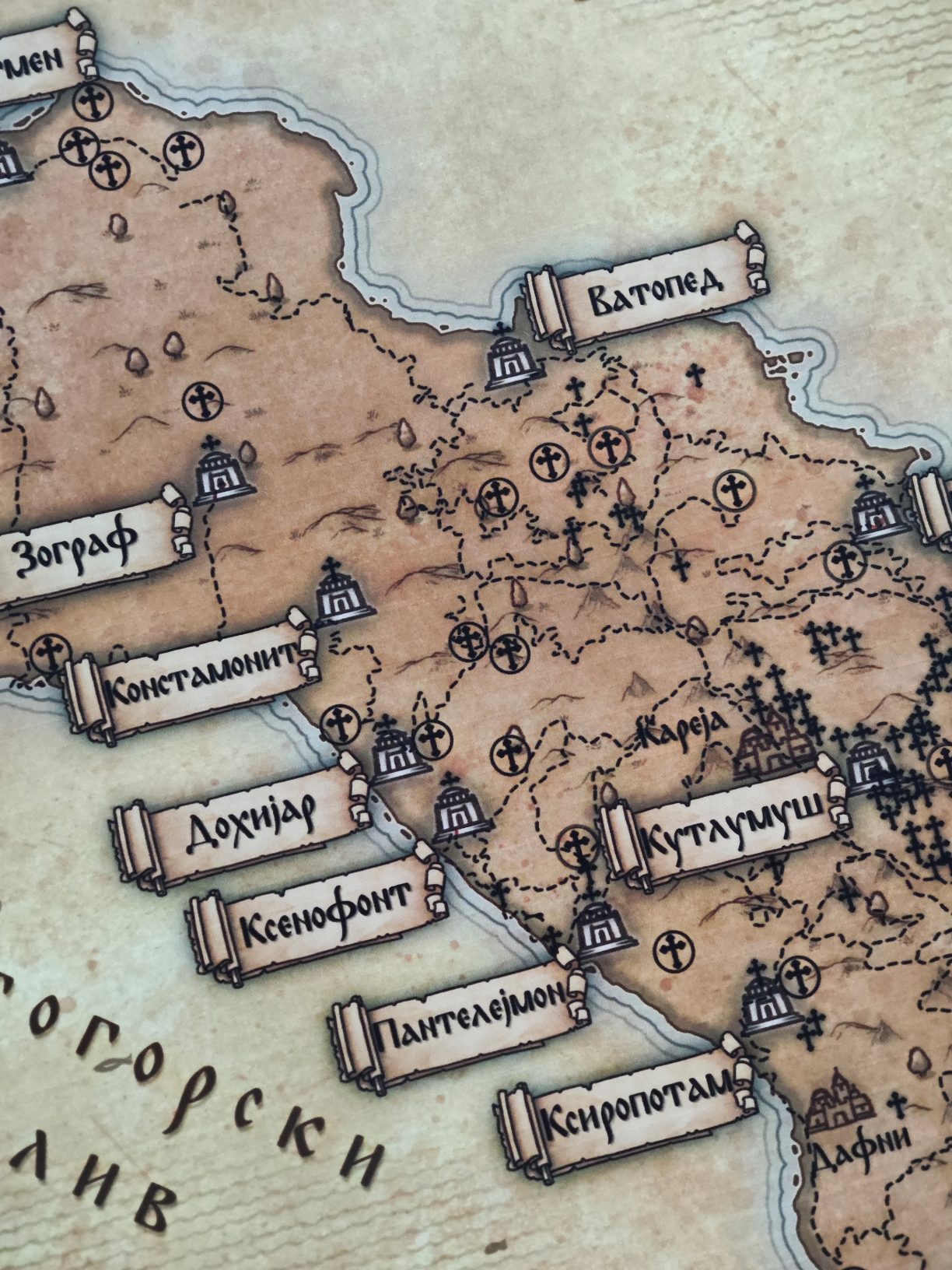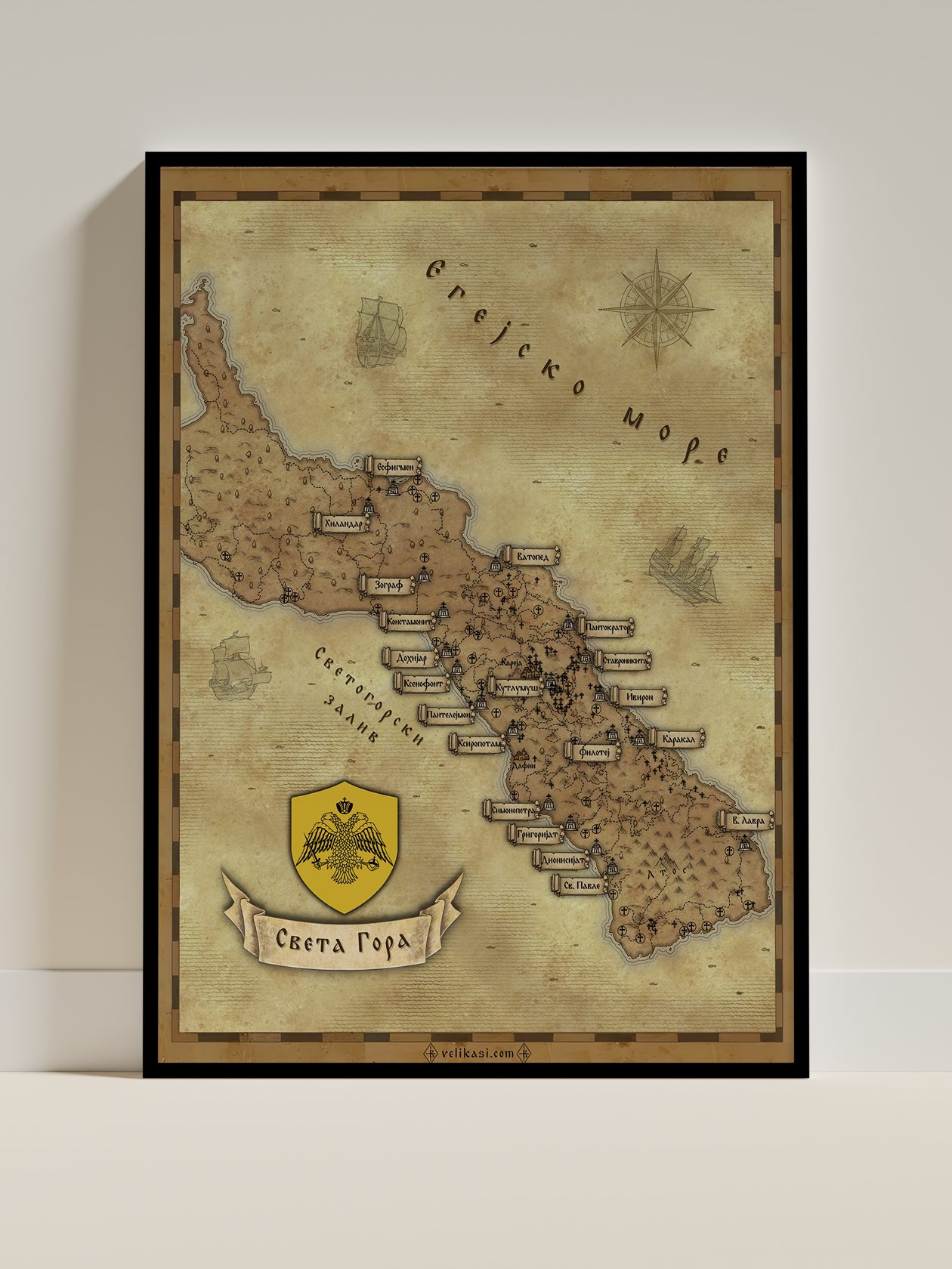 ■ Приказ територије Свете Горе и полуострва Атос ■ Илустрације манастира са њиховим локацијама ■ Јединствен дизајн инспирисан традицијом и православљем ■ Висококвалитетна штампа – спремно за урамљивање ■ Уз сваки примерак поклон – три налепнице Великаша и „Признање“ – захвалница