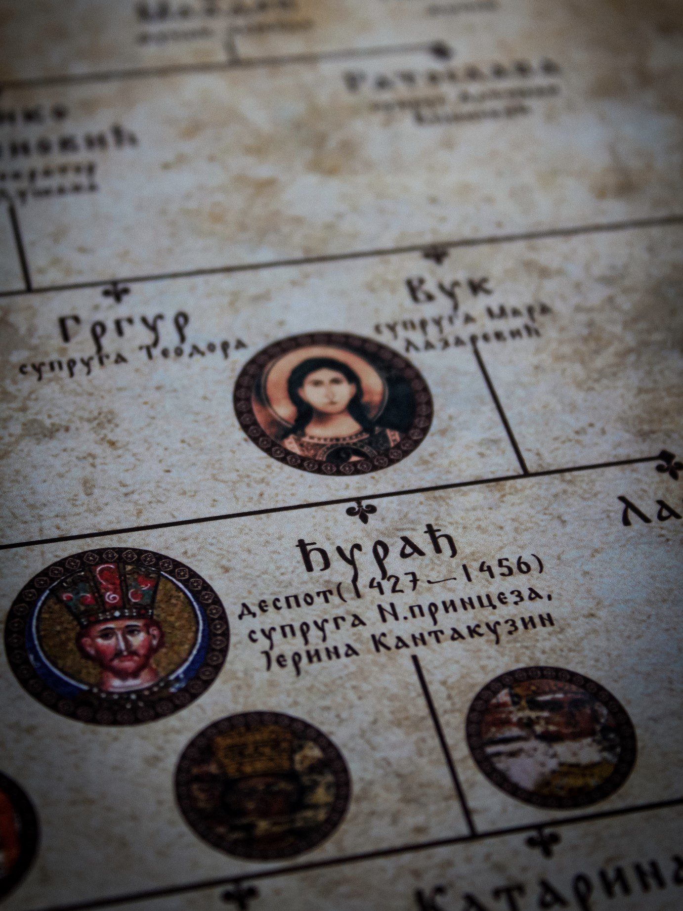 ■ Сваки владар из династије има слику у оквиру родослова, док се од детаља помињу и монашка имена, имена супруга као и титуле које су поседовали и у ком периоду. Такође, у оквиру родослова се налази QR код чије скенирање Вас води до странице династије Бранковић на нашем сајту, где можете наћи целокупне биографије чланова династије.